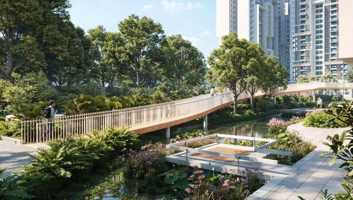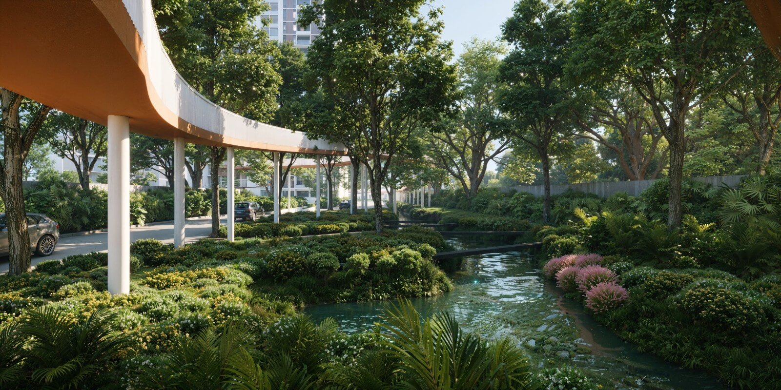 Planned with a nature-positive approach, the project integrates an Eco Pond (designed water reserve), Urban/Miyawaki Forest (~300+ trees), and a Sky Walk that links activity zones. Homes are oriented for light and airflow, with landscape, water, and community spaces stitched together for healthier daily living.