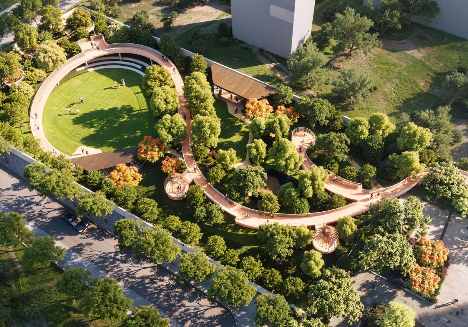 The masterplan spans ~7.5 Acres with ~80% Open Space, an elevated Sky Walk linking activity zones, a serene Eco Pond, and an Urban/Miyawaki Forest (~300+ Trees)- all set around a Vehicle-Free Podium.