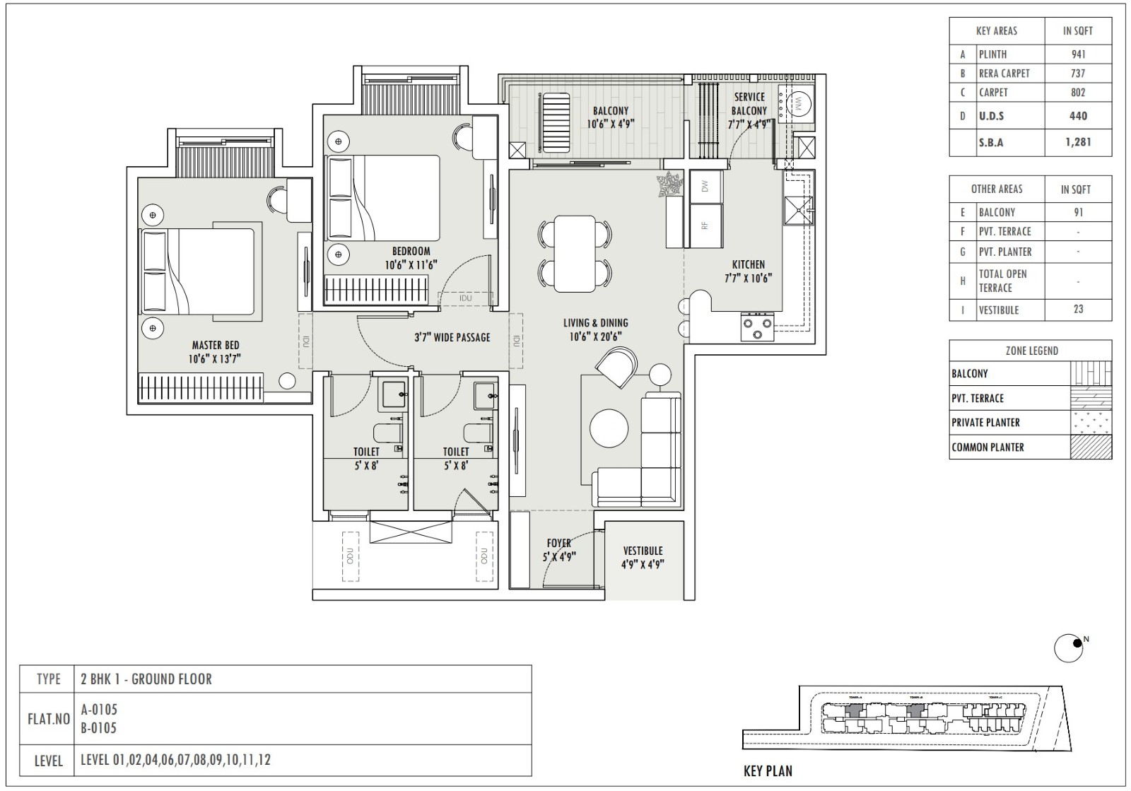 Homes are designed for Sunlight, Cross-Ventilation & Green Views with efficient layouts, Large Bay Windows and Green Balconies; 3BHK & 4BHK Sky-Villa Style Penthouses are also planned.