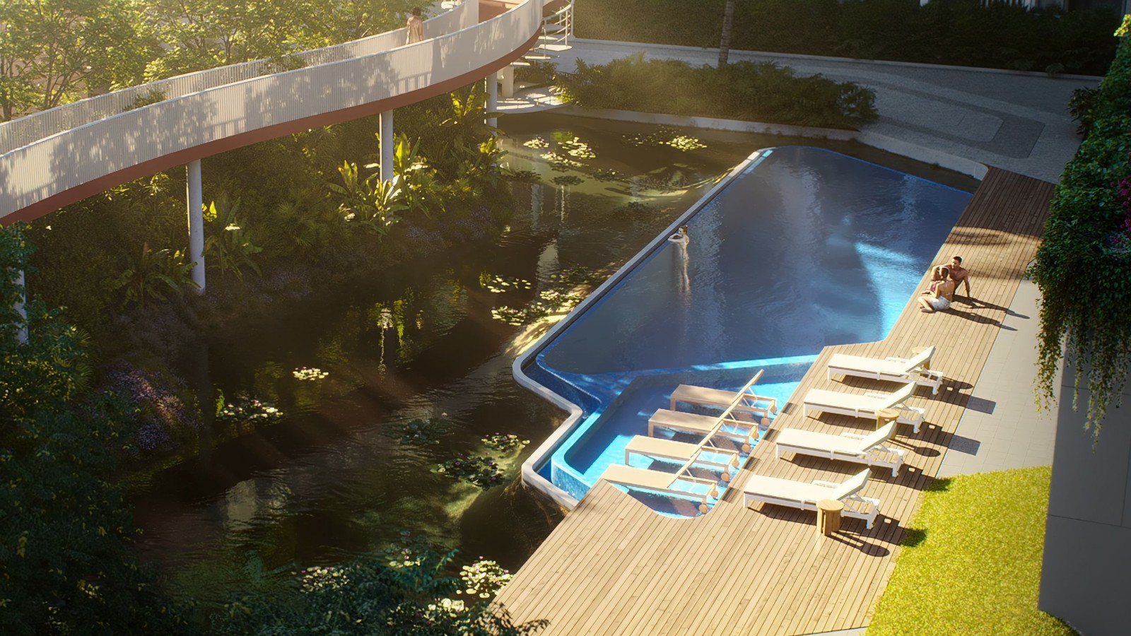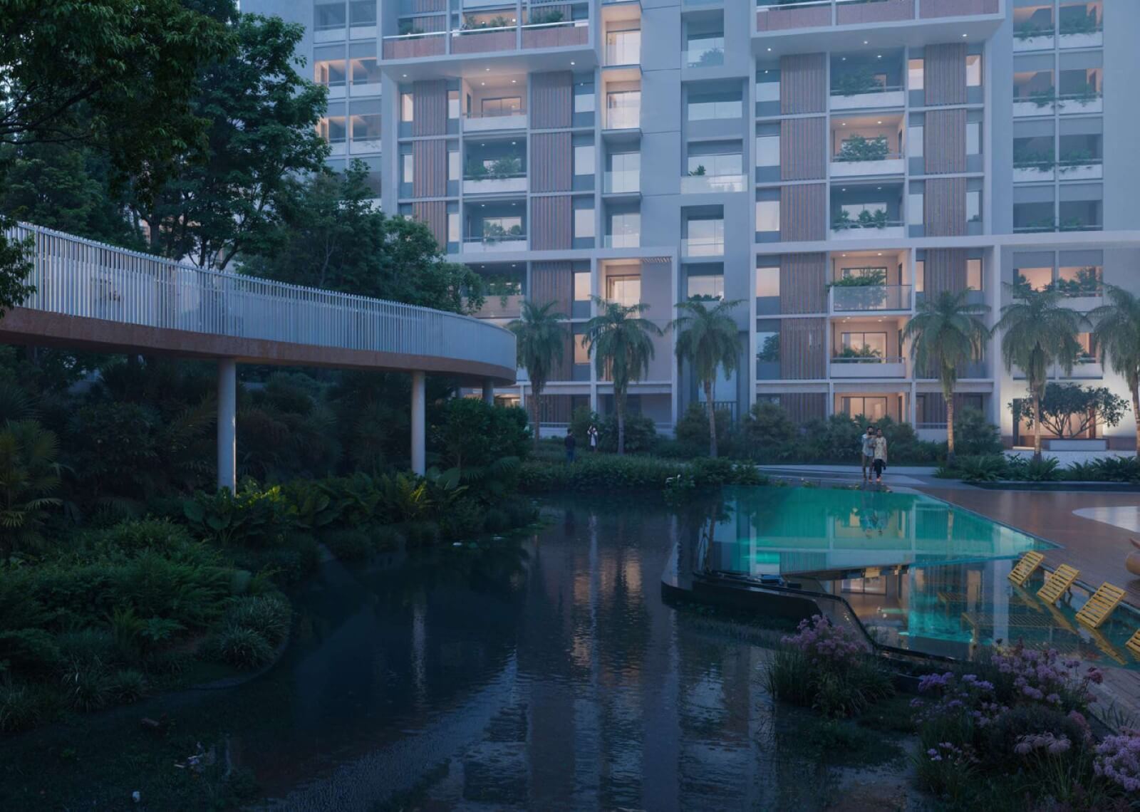 Planned with a nature-positive approach, the project integrates an Eco Pond (designed water reserve), Urban/Miyawaki Forest (~300+ trees), and a Sky Walk that links activity zones. Homes are oriented for light and airflow, with landscape, water, and community spaces stitched together for healthier daily living.