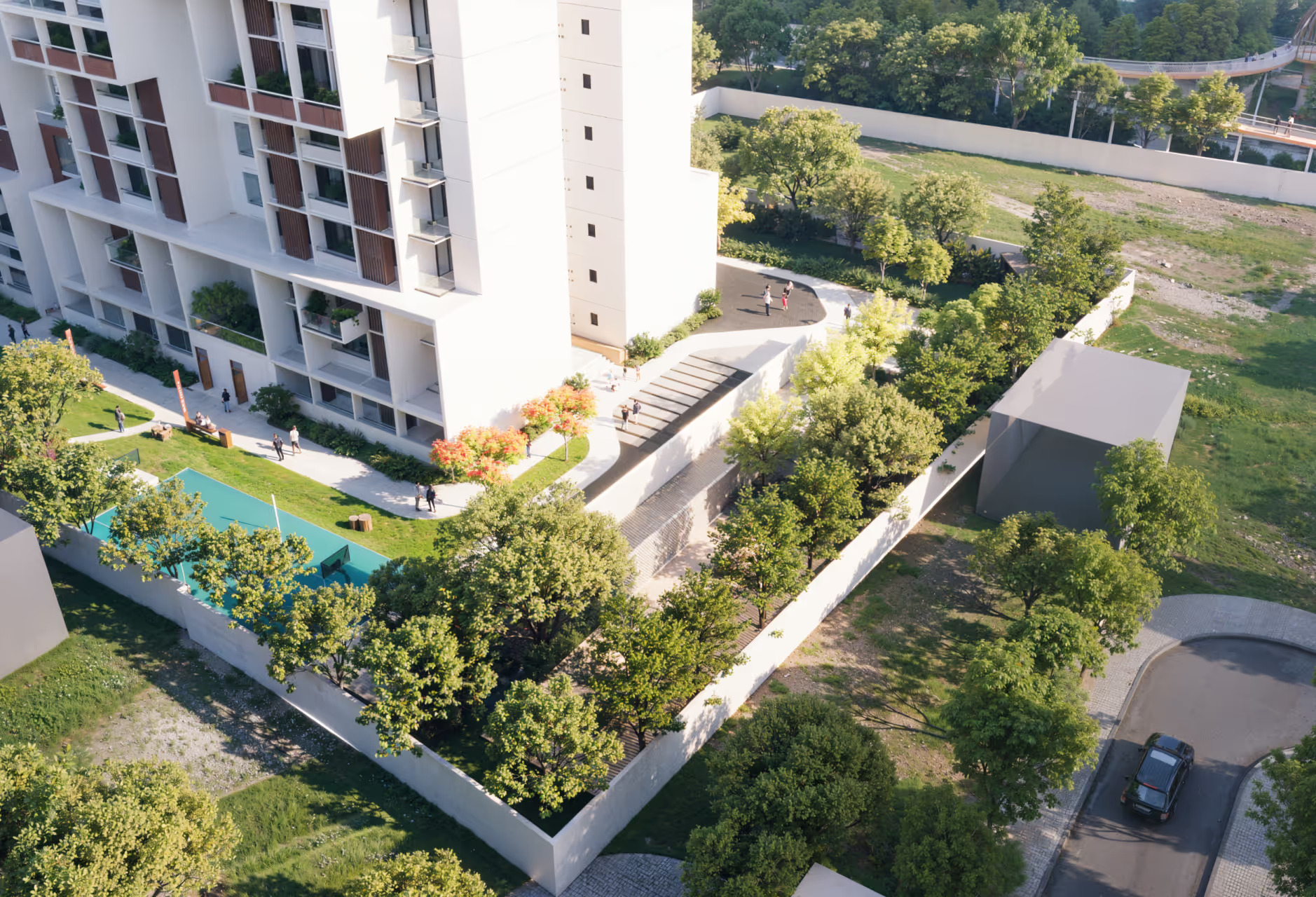 At Poetry Of Earth, community life centers around Apricity - A Grand G+4 Floors, 26,000 Sq Ft Clubhouse With 40+ Amenities. A Vehicle-Free Podium and a Skywalk Along The Central Spine knit together landscaped courts, activity pockets, and water features. The campus embraces nature with an Urban Miyawaki Forest (300+ Trees) and a serene Eco Pond, creating mindful spaces for wellness, leisure, and connection.